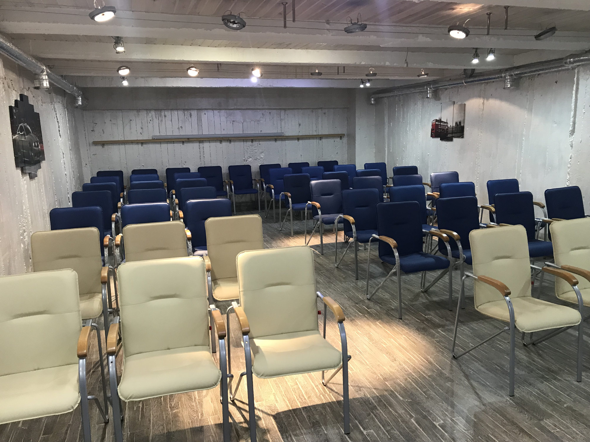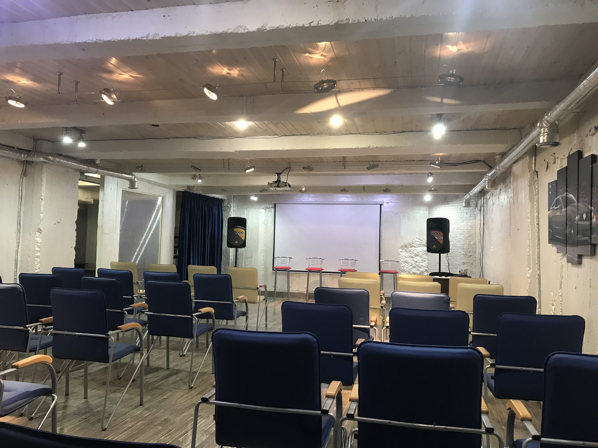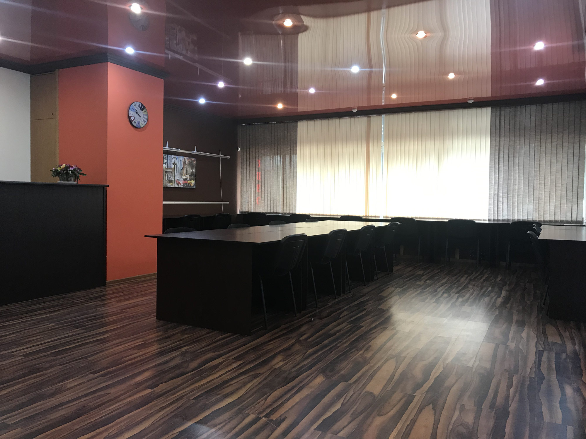- Большой конференц зал на 50-70 участников, расположение столов и стульев можно менять под любой формат мероприятия с любым уровнем шума.